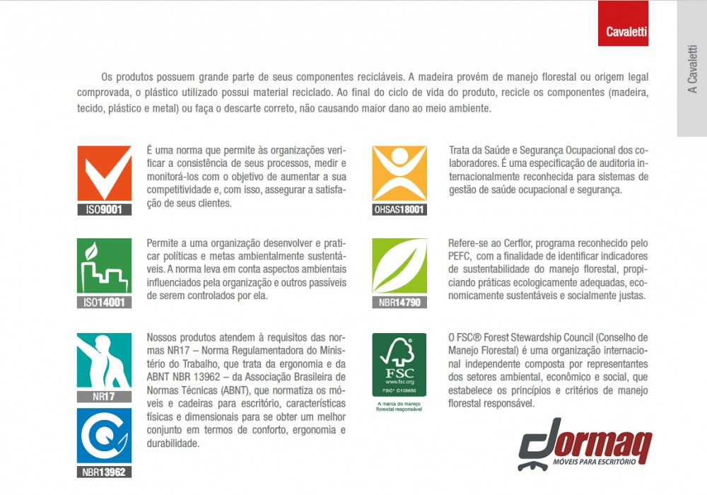 Os produtos CAVALETTI atendem aos requisitos: ABNT NBR ISO 9001; ABNT NBR ISO 14001 e OHSAS 18001; ABNT NBR 14790; ABNT NBR 13962 – da Associação Brasileira de Normas Técnicas (ABNT); Norma NR17 – Norma Regulamentadora do Ministério do Trabalho; ABNT NBR ISO 9001; ABNT NBR ISO 14001 e OHSAS 18001; ABNT NBR 14790; ABNT NBR 13962 – da Associação Brasileira de Normas Técnicas (ABNT); Norma NR17 – Norma Regulamentadora do Ministério do Trabalho.